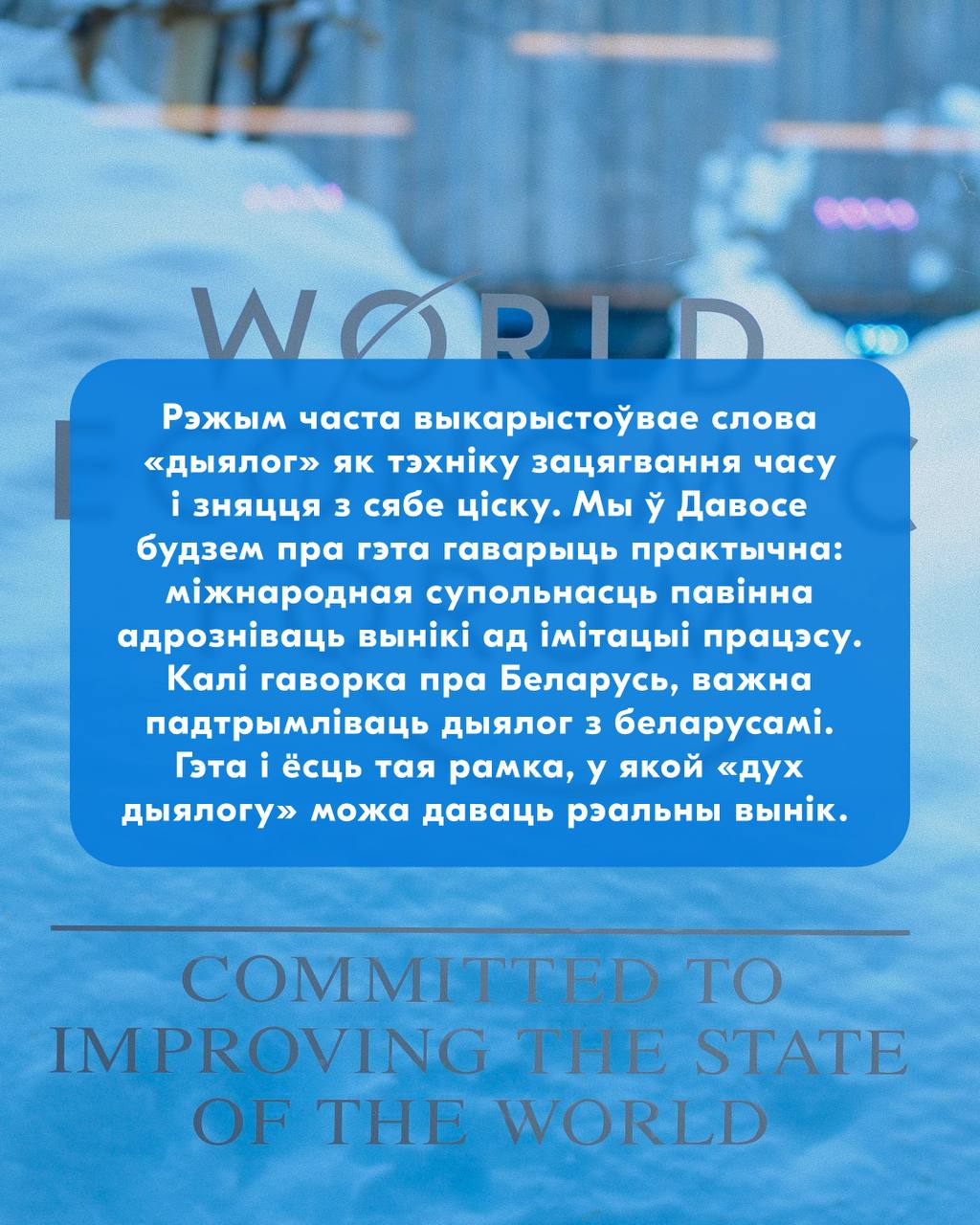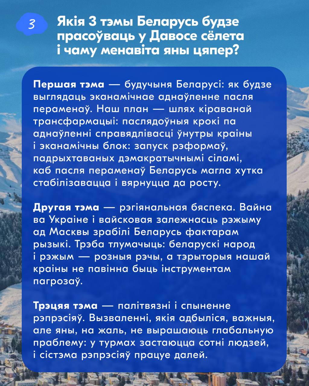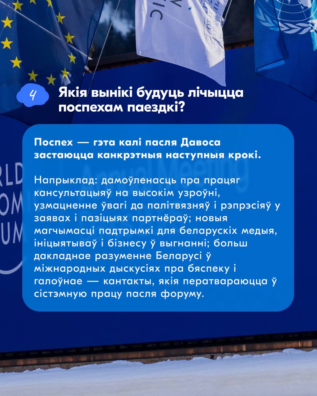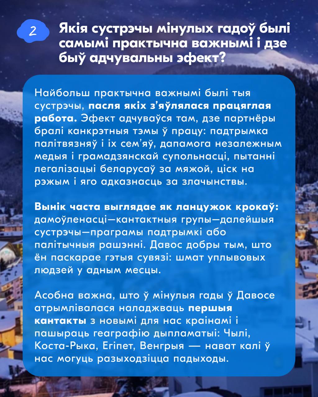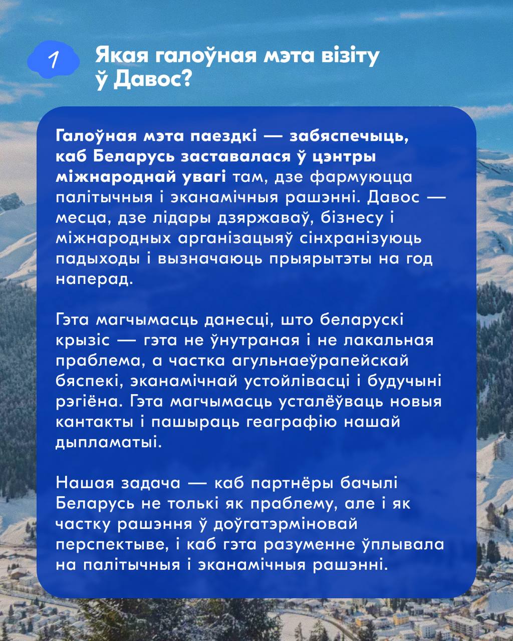 У картках адказваем на 5 галоўных пытанняў пра форум: мэта паездкі, сустрэчы, якія далі практычны эфект у мінулыя разы, якія тры тэмы Беларусь будзе прасоўваць сёлета, што будзе лічыцца поспехам і што для нас азначае «дыялог» на фоне бягучай палітычнай сітуацыі.