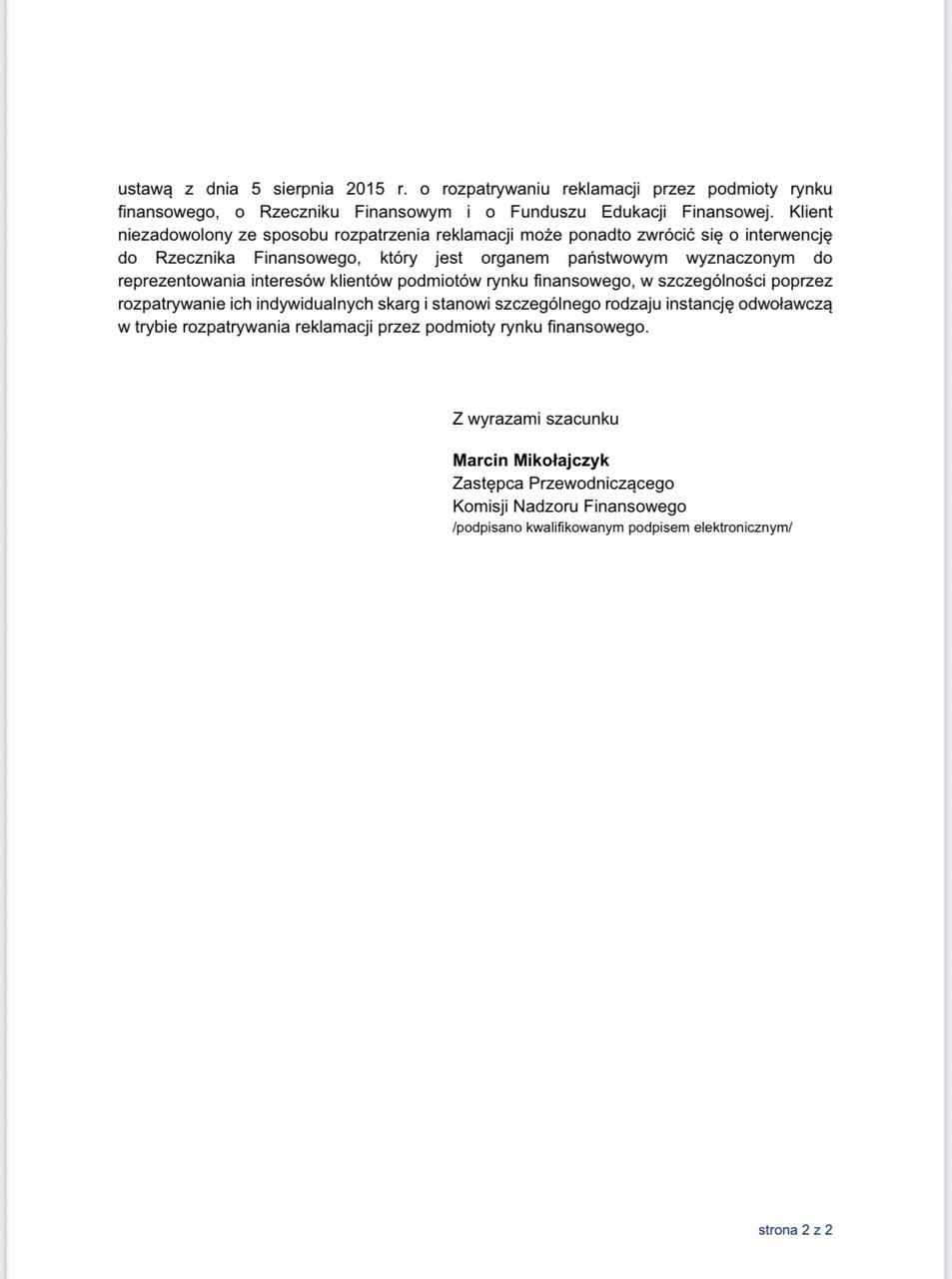 У адказ на гэты зварот Камісія фінансавага нагляду Польшчы заявіла, што «прааналізавала і абмеркавала з банкам сітуацыю, апісаную ў дачыненні да кліента банка, у кантэксце агульнапрынятай практыкі банка ў падобных справах. Банк заявіў, што з 30 снежня 2025 года рэалізаваў рашэнні, якія адпавядаюць патрабаванням Упраўлення фінансавага нагляду Польшчы. Гэтыя меры забяспечваюць прызнанне часовых пасведчанняў асобы замежніка ў якасці дакументаў, што пацвярджаюць асобу».